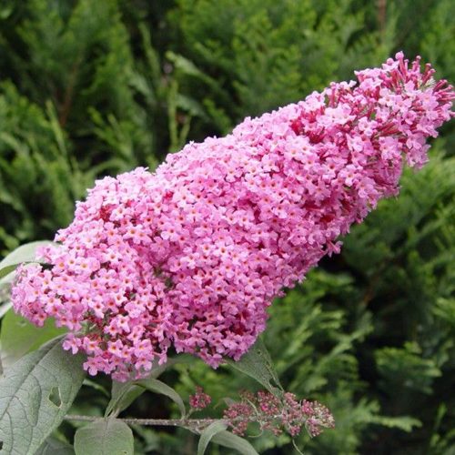 Листья у буддлеи узкие, ланцетные, серо-зелёные с тонким серебристым оттенком снизу — они подчёркивают насыщенный цвет соцветий. Цветение у Пинк Делайт начинается в середине лета и продолжается почти до осени. Соцветия крупные, удлинённые, собраны в плотные конусовидные метёлки, окрашенные в глубокий розовый оттенок. Аромат лёгкий, сладковатый, что привлекает бабочек и пчёл, оживляя сад и делая его более природным.