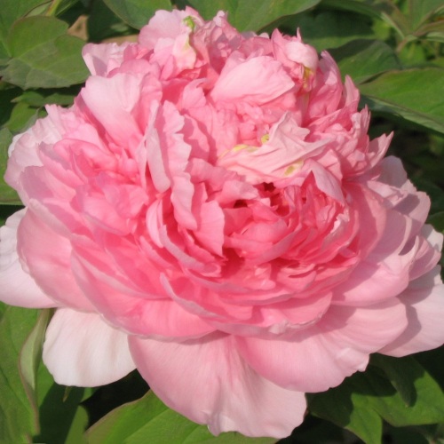 Цветы появляются в конце мая — начале июня и держатся около 2–3 недель. Диаметр цветка составляет 16–20 см. Лепестки многорядные, широкие, слегка волнистые, создают воздушный и плотный бутон. Окрас нежно-розовый с перламутровым блеском, центр более насыщенный, придающий цветку глубину. Аромат мягкий, сладковатый и ненавязчивый.