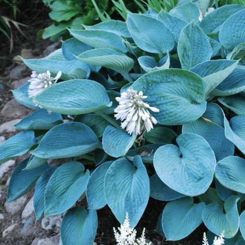 Эта хоста обладает уникальными пузырчатыми листьями, имеющими форму широкого сердца с тупым концом. Длина листьев достигает 36 см, они плотные и морщинистые, с ярко выраженным жилкованием. В начале сезона их окрас насыщенно голубой, который постепенно трансформируется в сине-зеленый к середине лета. Декоративность листьев сохраняется на протяжении всего вегетационного периода.