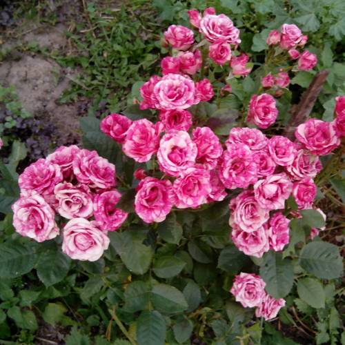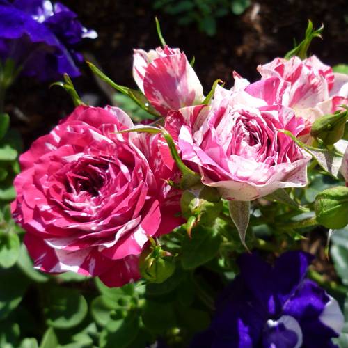 Бутон розы окрашен в нежный розовый цвет, который при распускании превращается в яркий малиново-розовый с белыми полосами. Такая двухцветная окраска придает цветку особую выразительность и динамичность. Махровые цветки диаметром 3-5 см являются маленькими, но чрезвычайно эффектными. Каждый цветок состоит из 25 нежных лепестков, расположенных в плотных соцветиях. На одном стебле может распуститься от 5 до 10 цветков одновременно. Интенсивность аромата слабая, но это с лихвой компенсируется их ярким внешним видом.