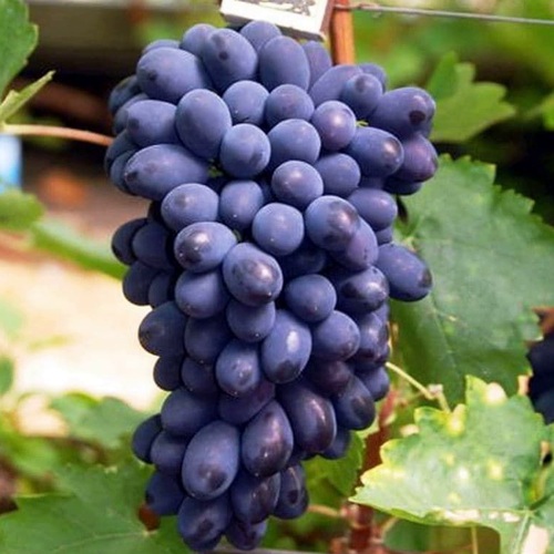 Срок созревания — 110–118 дней, урожай собирают в конце июля – начале августа. Грозди цилиндро-конические, массой 400–600 г, при хорошем уходе — до 1–1,5 кг. Ягоды крупные, овальные, тёмно-фиолетовые, весом 6–8 г, с плотной мякотью и съедобной кожицей. Вкус сладкий, гармоничный. Сахаристость — 16–19 %, косточки присутствуют.