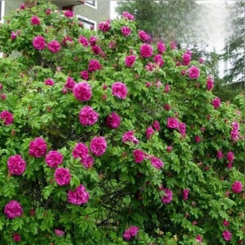 Цветки махровые, крупные — 7–10 см в диаметре, насыщенного розово-пурпурного цвета. Цветение начинается в начале лета и повторяется до первых заморозков. Плотные лепестки формируют объемные чашевидные цветы, а сильный пряный аромат делает куст заметным в саду.